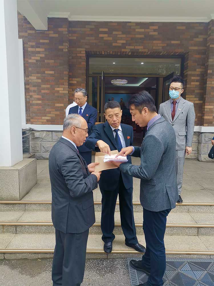9月9日是朝鮮的國慶節!今天是我們的友好鄰邦朝鮮創(chuàng )建72周年的日子!上午,沈陽(yáng)山和大海進(jìn)出口貿易有限公司總經(jīng)理趙斌一行,手捧祝賀朝鮮創(chuàng )建72周年的花籃,來(lái)到朝鮮駐沈陽(yáng)總領(lǐng)事館,將花籃放置在朝鮮兩位偉人肖像前,并鞠躬致敬!他們的來(lái)訪(fǎng),受到金永日副總領(lǐng)事的熱烈歡迎,趙斌委托金副總領(lǐng)事轉交寫(xiě)給金委員長(cháng)的賀電!趙斌受其他幾位中國同志們的托付,將他們捐給朝鮮兩偉人基金的捐款,委托金領(lǐng)事轉交平壤基金本部!中國與朝鮮是有著(zhù)深厚傳統友誼的友好近鄰!我們衷心祝愿朝鮮朋友們國慶節快樂(lè )!按照兩國領(lǐng)導人數次會(huì )面達成的重要共識,我們愿為繼續深化中朝兩國的友誼多做貢獻!