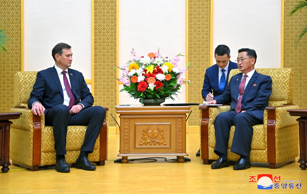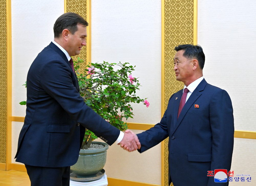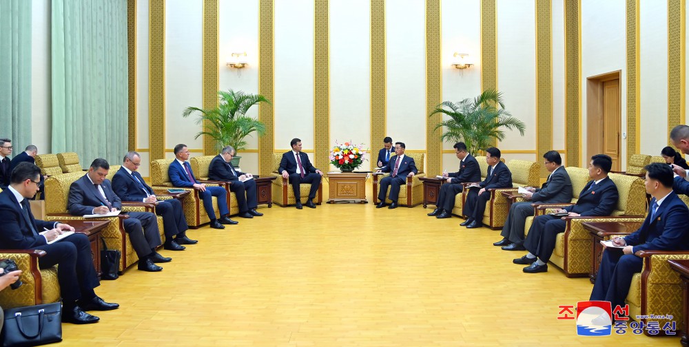 朝中社平壤7月26日電 朝鮮勞動(dòng)黨中央委員會(huì )政治局常務(wù)委員會(huì )委員、朝鮮民主主義人民共和國國務(wù)委員會(huì )副委員長(cháng)、內閣總理金德訓25日在萬(wàn)壽臺議事堂會(huì )見(jiàn)了前來(lái)拜訪(fǎng)的白俄羅斯共和國外交部長(cháng)馬克西姆·雷任科夫。