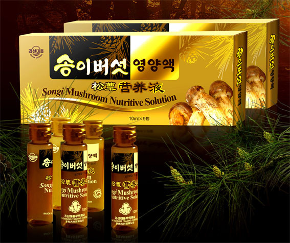松蕈營(yíng)養液系以朝鮮名山七寶山松蕈精制而成,是一種天然保健食品, 富含必需氨基酸、生理活化劑、核酸物質(zhì)、不飽和脂肪酸、維生素、多糖。 成分:松蕈、酒精 功效:解除疲勞、強壯及強化性機能、清血、防老化、舒緩緊張、抗炎癥、復蘇免疫。 用法:一日3-5次,一次10ml口服。